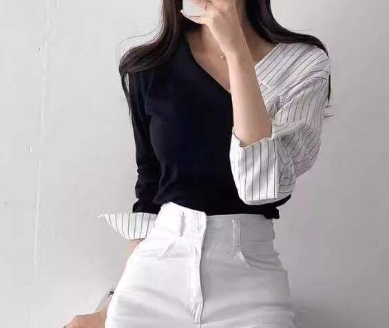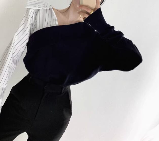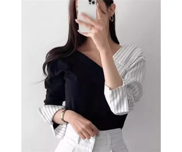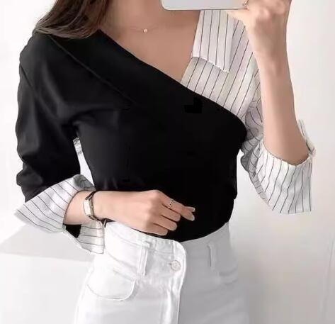 レディース トップス シャツ プルオーバー ショート アシンメトリー 左右非対称 長袖 Vネック 襟付き ポロカラー 切り替えデザイン ドッキング サテン かわいい 大人可愛い きれいめ カジュアル 上品 おしゃれ かっこいい ボーイッシュ 個性的 クール エレガント モダン 存在感 ラグジュアリー 知的 ハンサム シック 高級感 無地 ストライプ 秋 デート お出かけ 韓国 普段使い 着回し フリーサイズ ブラック