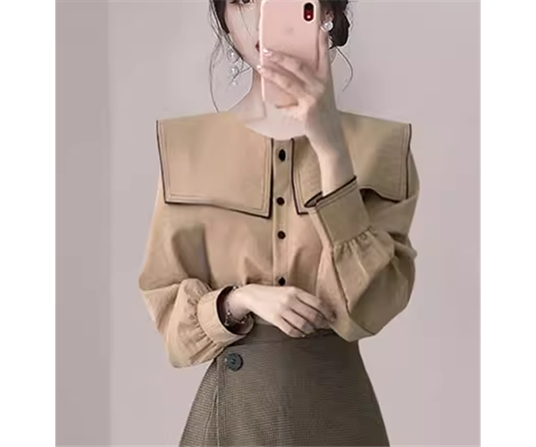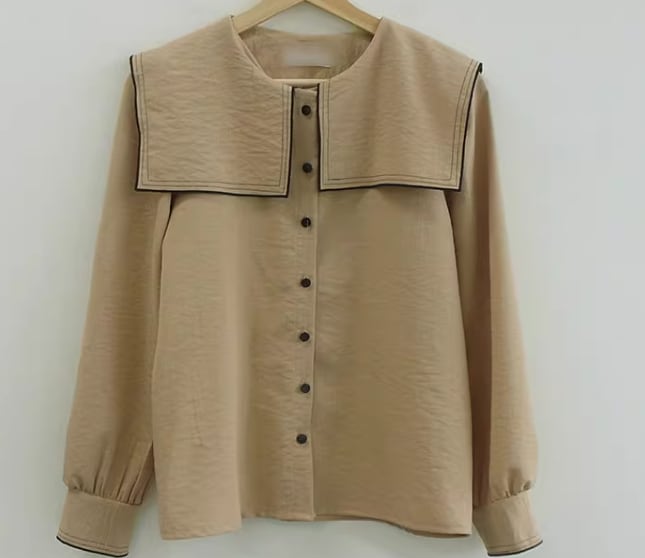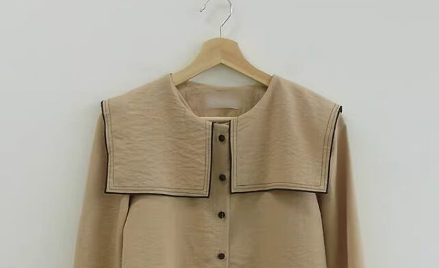 優しいブラウンの色味と大きめの四角い形の襟が特徴的な長袖シャツ。