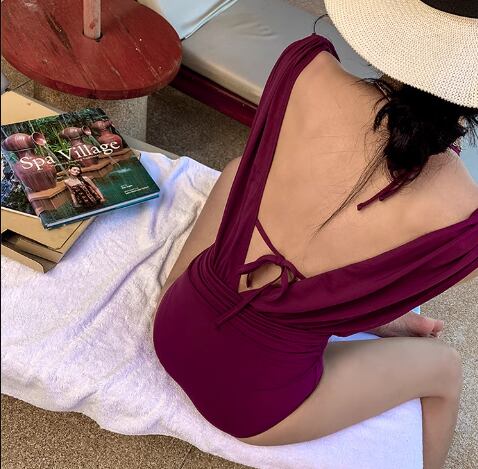 ざっくりと開いた胸元と背中がセクシーな大人っぽい雰囲気の水着。