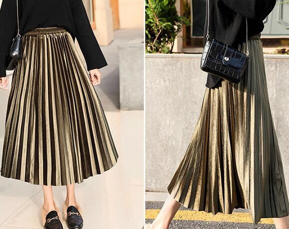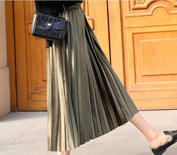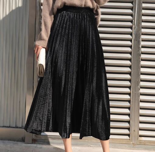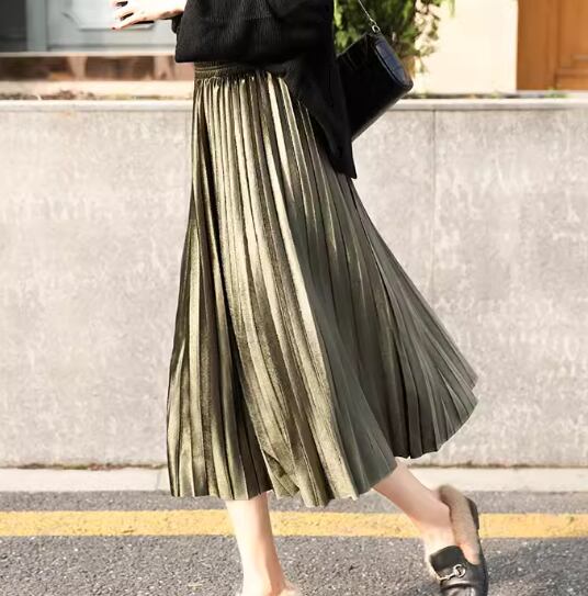 レディース スカート プリーツスカート 膝下 ミモレ Aライン フェミニン ハイウエスト 薄手 ベルベット かわいい 大人可愛い きれいめ シンプル カジュアル 上品 おしゃれ ガーリー クール エレガント キュート シック 高級感 華やか 優しい 穏やか フェアリー 無地 春 秋 デート お出かけ 普段使い 着回し 清楚 S M L XL 大きいサイズ ブラック カーキ 光沢 メタリック シャンパン
