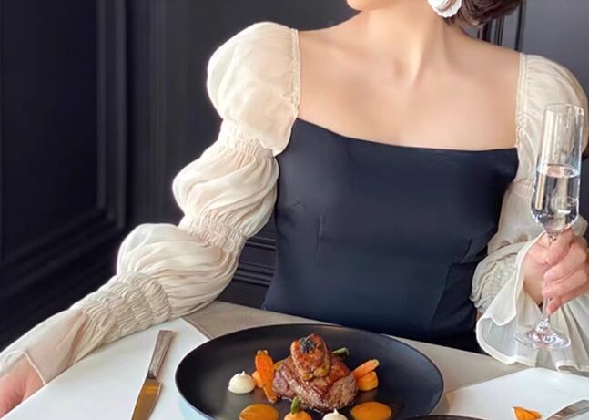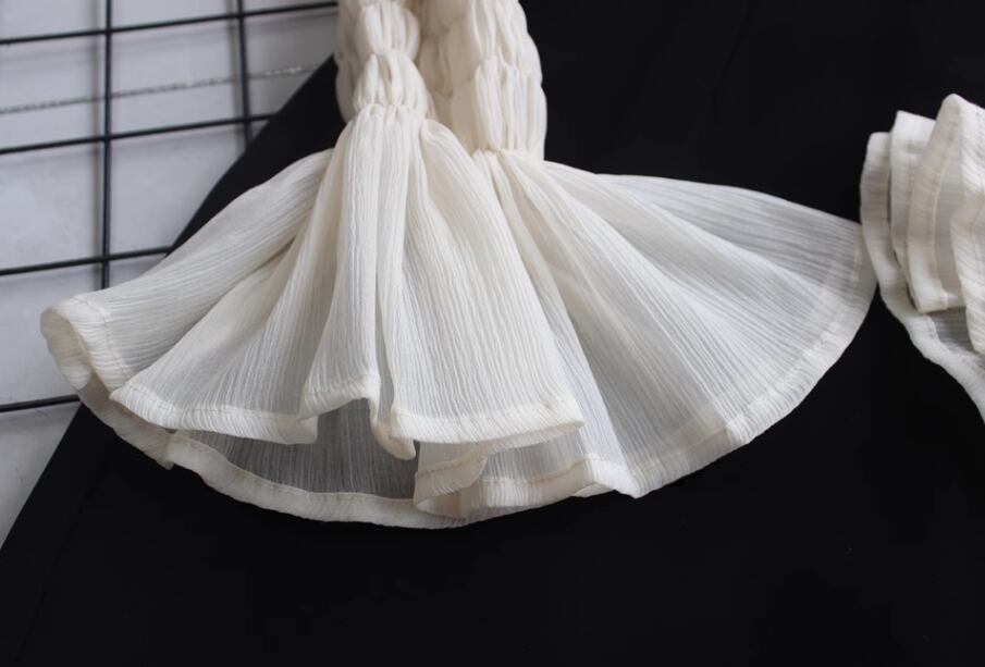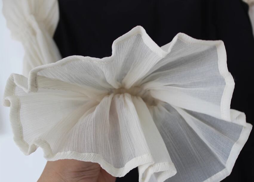 デコルテラインが美しく見えるデザインと袖のフリルが魅力的。