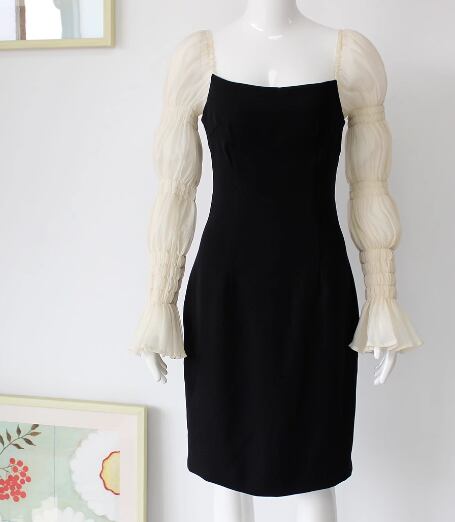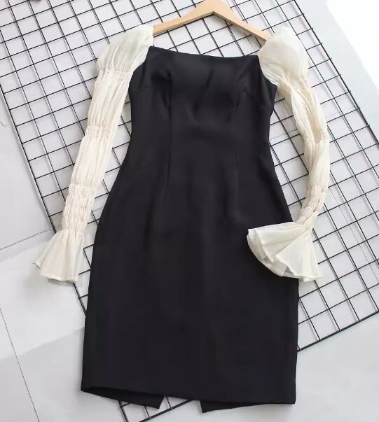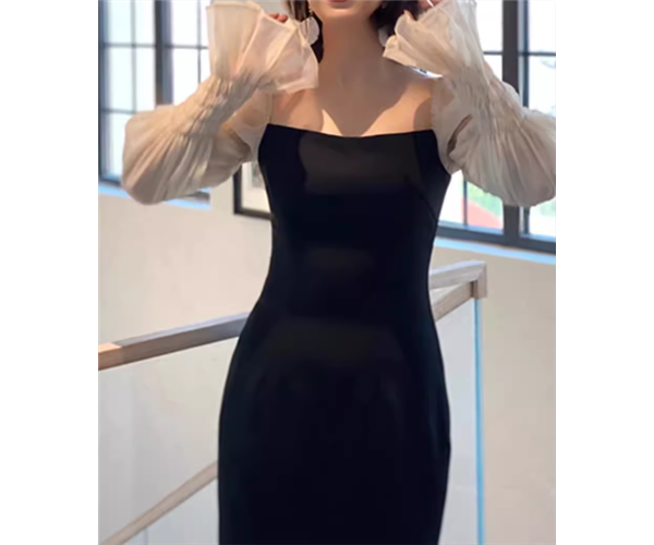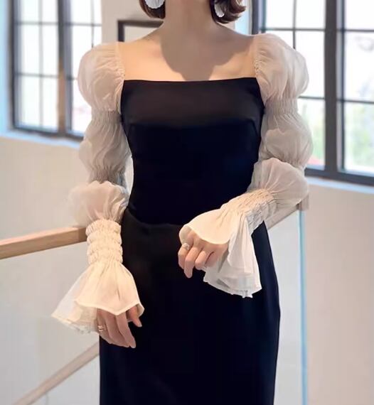 レディース ドレス パーティードレス ブラックドレス ウェディング パーティー 結婚式 二次会 披露宴 膝下 ミモレ 長袖 スクエアネック タイト スリム 細身 フリル 切り替えデザイン ドッキング きれいめ シンプル 大人可愛い 上品 おしゃれ エレガント 清楚 ゴージャス シック 高級感 セレブリティ フェミニン 女性らしい 無地 イベント ホテル レストラン デート 食事会 会食 高見え 女子会 春 夏 フリーサイズ ブラック