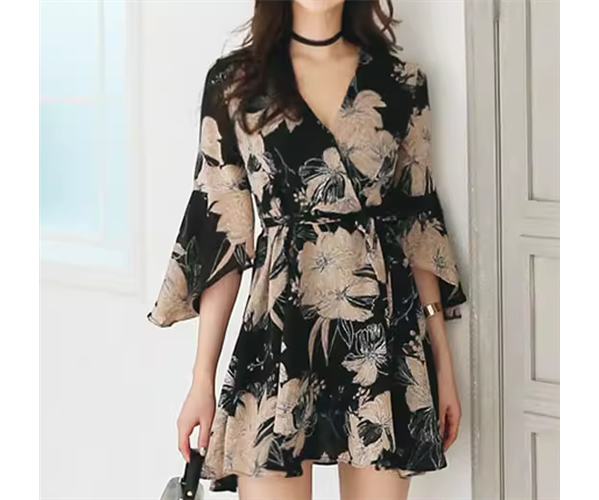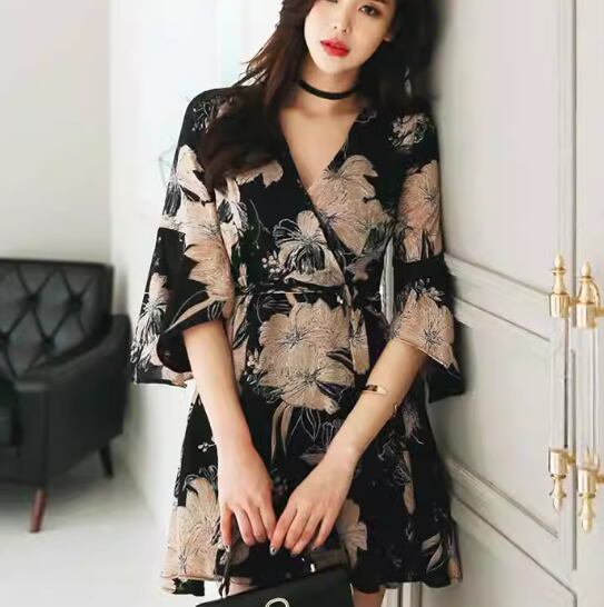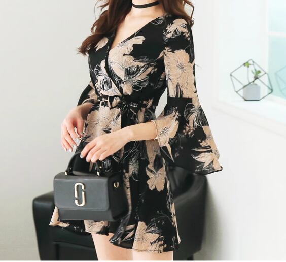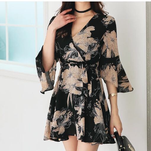 レディース ワンピース ミニ ショート 7分袖 ベルスリーブ Vネック フェミニン シフォン フリル ウエストマーク ファスナー ハイウエスト かわいい 大人可愛い きれいめ 上品 おしゃれ こなれ感 ガーリー エレガント 存在感 キュート ラグジュアリー 豪華 セクシー シック 高級感 芸術的 アーティスティック 華やか フェアリー 花柄 フラワー プリント 秋 デート お出かけ 普段使い S M L ブラック