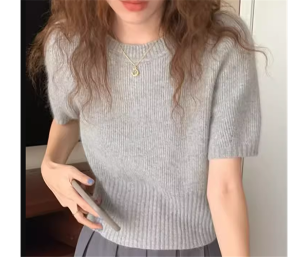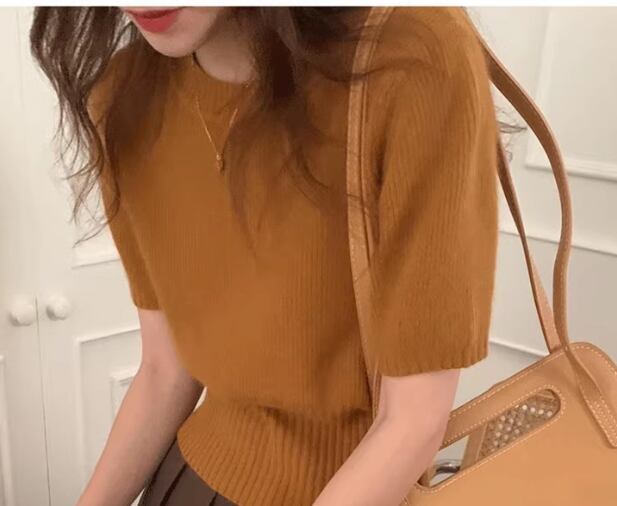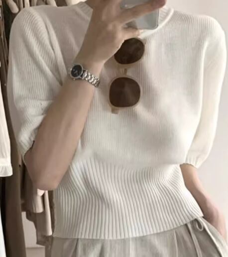 レディース トップス ニット セーター プルオーバー ショート クロップド丈 半袖 パフスリーブ ラウンドネック フェミニン 大人可愛い きれいめ シンプル カジュアル 上品 おしゃれ かっこいい レトロ ボーイッシュ クール エレガント ナチュラル ハンサム シック 高級感 無地 春 夏 秋 デート お出かけ 普段使い 着回し 定番 S M L XL ホワイト ブラック ブラウン グレー アプリコット