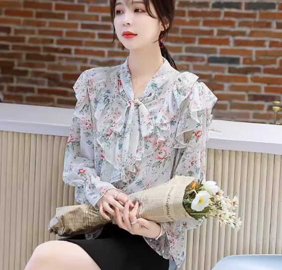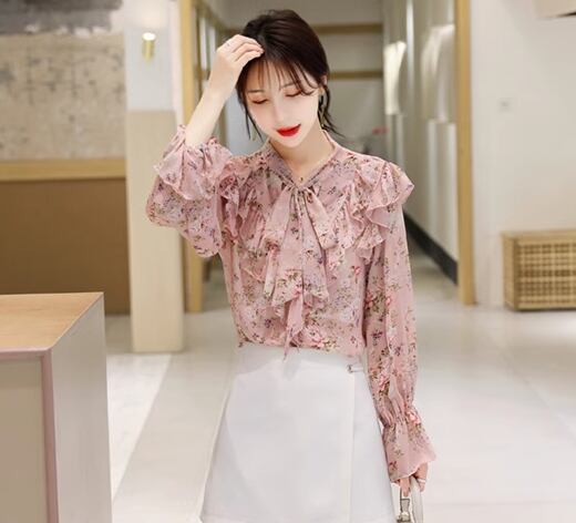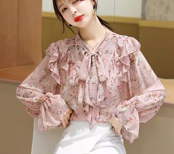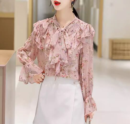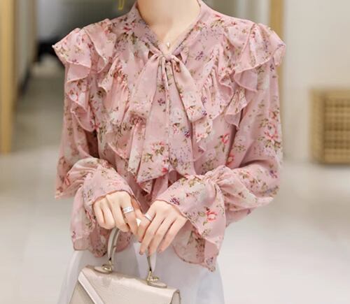 フリルやリボンといった女性らしい要素盛りだくさんの華やかなシフォンシャツ。