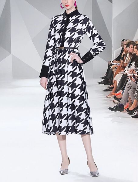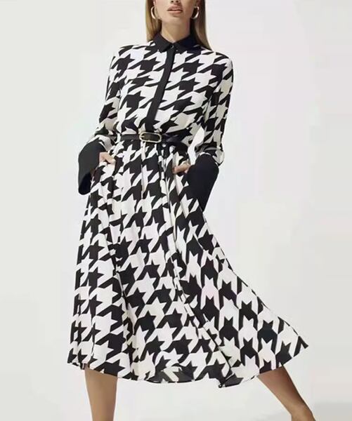 エレガントな女性のためのミッドレングスドレスが登場です。洗練されたデザインで、シックな印象。程よい肌の露出を保ちながら上品な装いを演出しています。千鳥格子のプリントが、クラシカルな雰囲気を醸し出し、着る人の魅力を引き立てます。上質な素材で作られており、着心地は快適!様々なシーンで活躍する一着です。