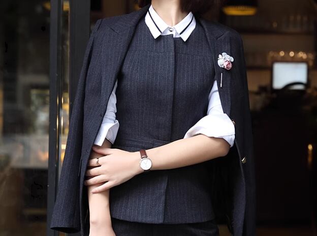 スマートな美シルエットと大人っぽいストライプ模様が魅力的なスーツの上下セット。