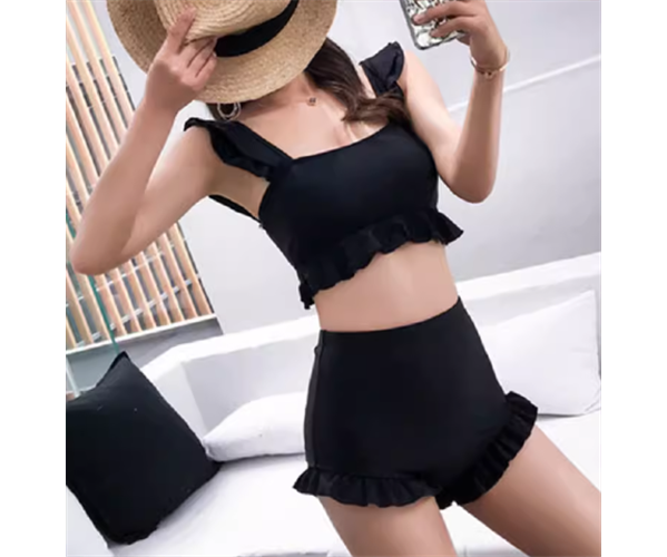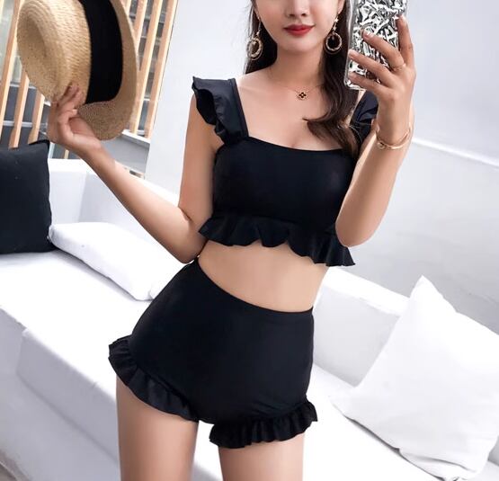 水着 ビキニ レディース セパレート ノンワイヤー パッド付き フリル ハイウエスト セット ツーピース 上下セット かわいい 大人可愛い きれいめ シンプル カジュアル 大人っぽい おしゃれ お洒落 キュート ガーリー セクシー フェミニン シック 無地 リゾート 旅行 温泉 プール 夏 海 体型カバー スタイルカバー お腹カバー S M L XL Aカップ Bカップ Cカップ 大きいサイズ ブラック