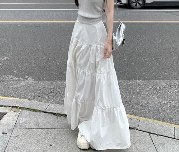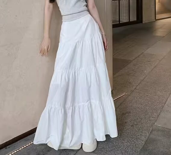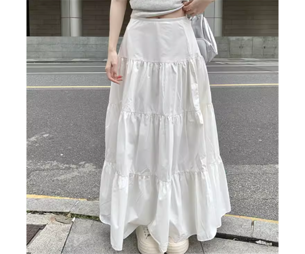 清潔感のある真っ白な生地と女性らしいティアードデザインが魅力的なロングスカート。