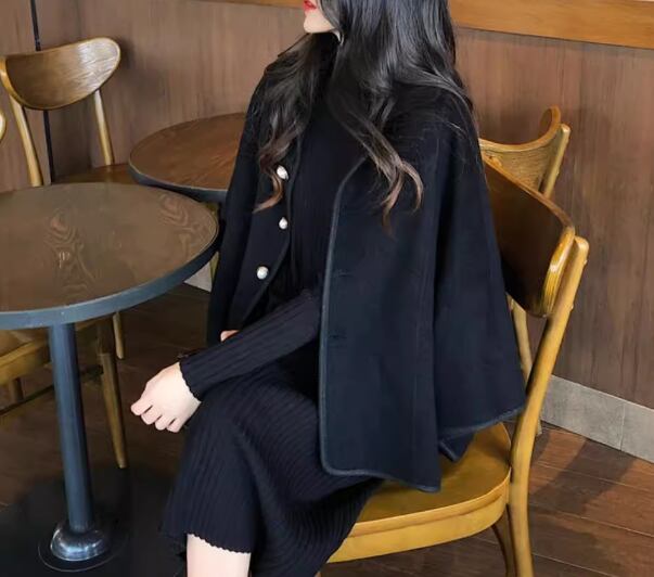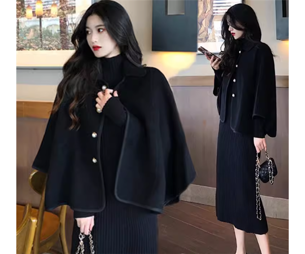 しっかりとした厚みのある暖かいケープコートとミモレ丈のシンプルなニットワンピースの二点セット。