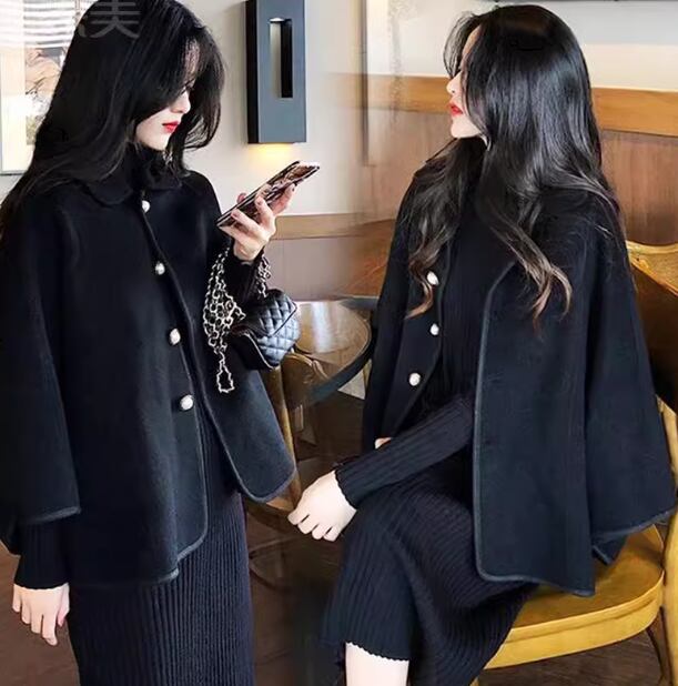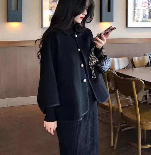 二点セット ツーピース レディース ワンピース コート セットアップ ニットワンピ ウール ケープコート 長袖 ハイネック フェミニン ハイウエスト ボタン 厚手 かわいい 大人可愛い きれいめ シンプル 上品 おしゃれ かっこいい こなれ感 クール エレガント ラグジュアリー 豪華 セレブリティ 無地 秋 冬 デート お出かけ 重ね着 暖かい 防寒 体型カバー 普段使い 着回し レイヤード M L XL 大きいサイズ ブラック