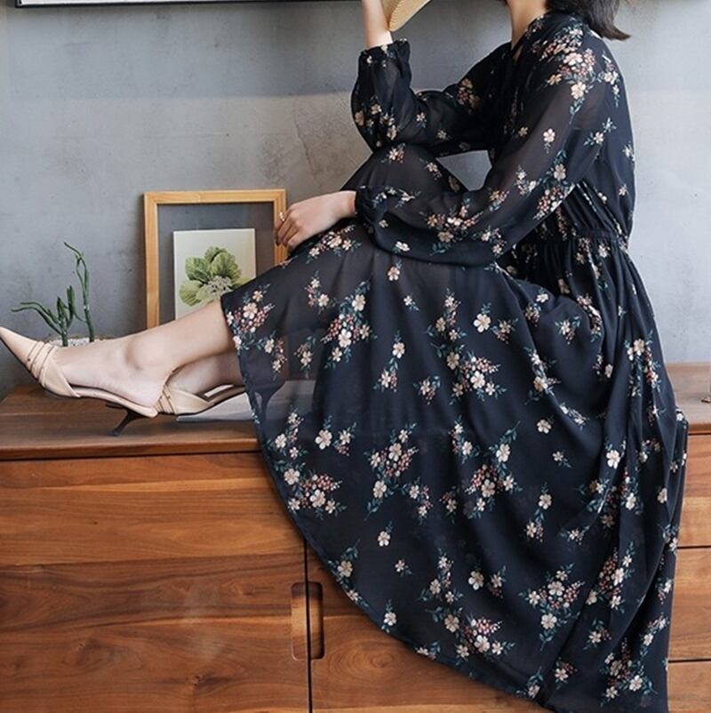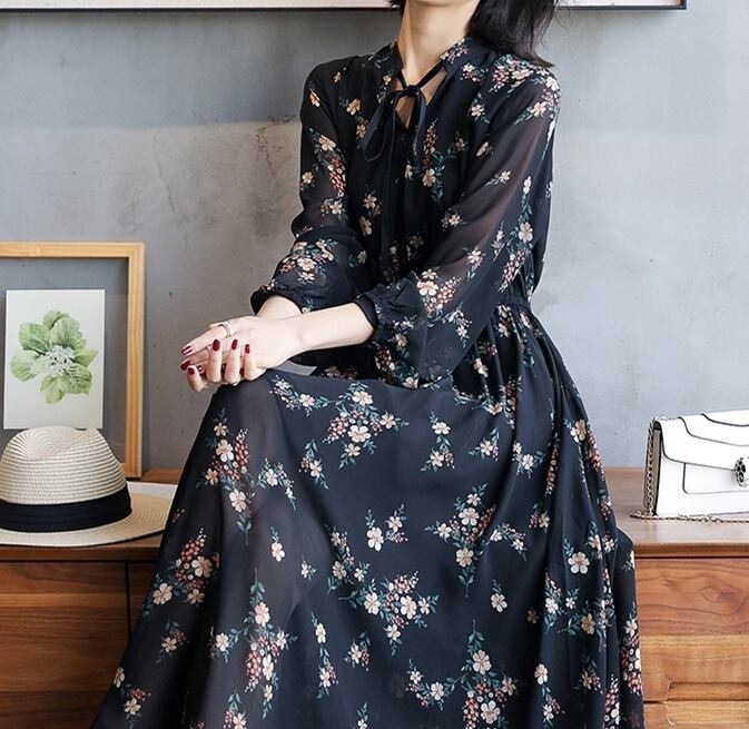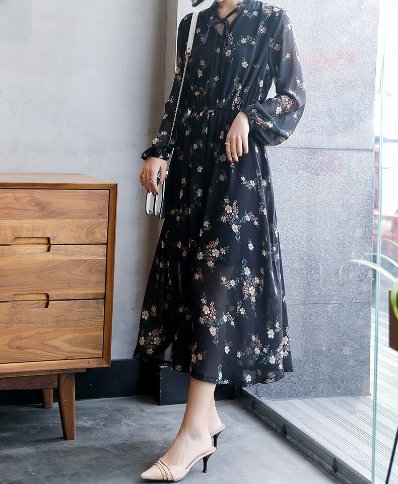 レディース ワンピース ロング 長袖 ランタンスリーブ Vネック りぼんタイ フレア Aライン 裾ワイド フェミニン レース シフォン リボン ハイウエスト ウエストゴム 透け感 シースルー 薄手 シアー 大人可愛い きれいめ 上品 エレガント 主役級 存在感 都会的 華やか 花柄 フラワー 春 謝恩会 結婚式 二次会 披露宴 デート リゾート レストラン モテ 清楚 M L XL 2XL ゆったり ゆる ブラック