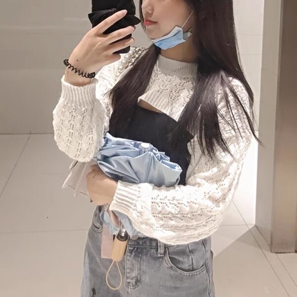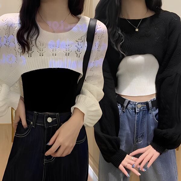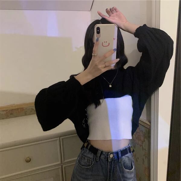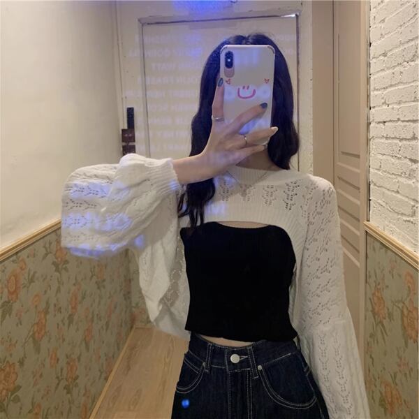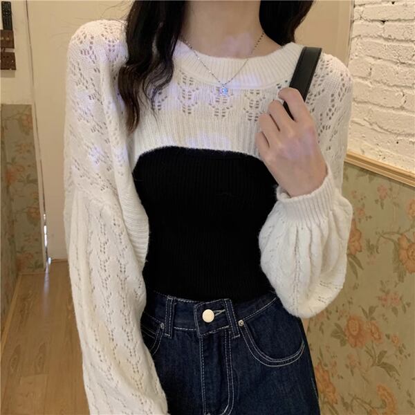 スリングのキャミソール風インナーと、大胆なクロップド丈長袖セーターの “白&黒”2点セット。キャミソール風のインナーは、女性らしいシルエットを引き立て、夏の涼しげな着こなしを叶えます。クロップド丈の長袖セーターは、レイヤードスタイルが簡単に楽しめ、着回し力抜群です。おしゃれなコーディネートを自在に演出しましょう。