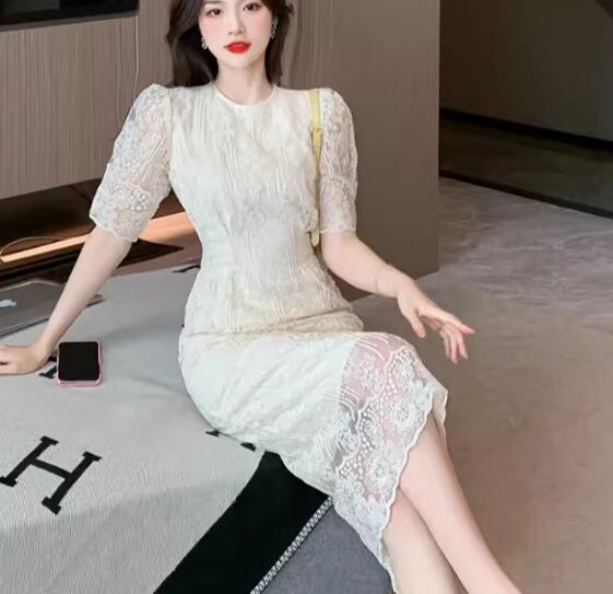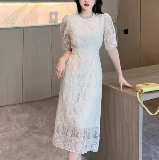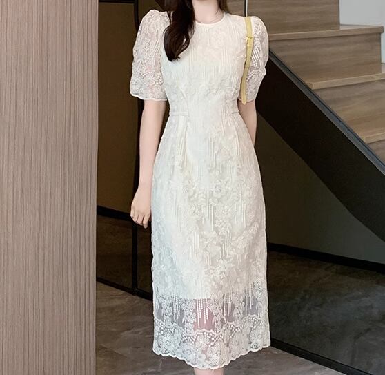 レディース ドレス ワンピース パーティー 膝下 ミモレ 半袖 パフスリーブ ラウンドネック Aライン レース ウエストマーク ファスナー バックスリット 可愛い きれいめ 大人可愛い 上品 おしゃれ キュート ガーリー エレガント 抜け感 清楚 シック ラグジュアリー 高級感 セレブリティ フェミニン 女性らしい フェアリー イベント ホテル レストラン デート 食事会 会食 高見え 女子会 夏 S M L XL 大きいサイズ アプリコット