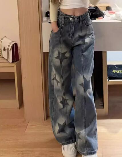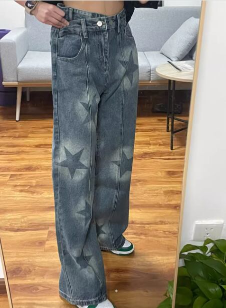 レディース パンツ ボトムス デニム ジーンズ Gパン フルレングス ワイド ストレート ストリート ファスナー ポケット ハイウエスト ブルーデニム かわいい カジュアル おしゃれ かっこいい レトロ ラフ ボーイッシュ ルーズ 個性的 クール プリント 星柄 春 秋 10代 20代 学生 デート お出かけ 体型カバー 脚長 普段使い 着回し トレンド 流行 S M L XL 大きいサイズ ゆったり ブルー