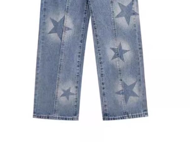 星柄のプリントが個性的でおしゃれなフルレングスのワイドストレートジーンズ。