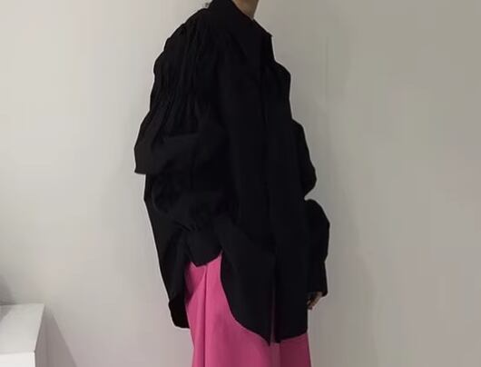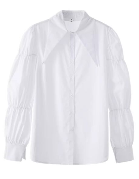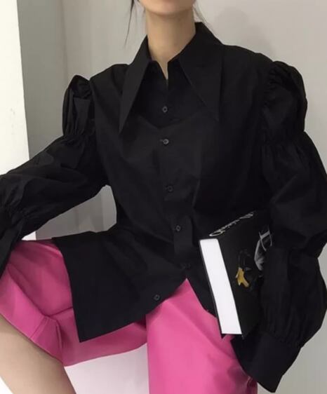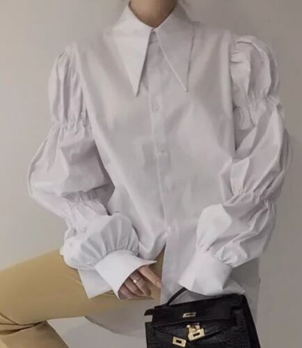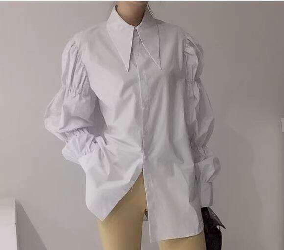 大きめの襟とボリューム感のある袖がおしゃれな長袖シャツ。