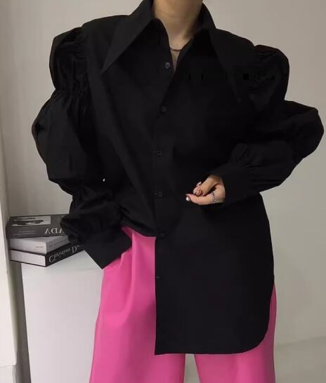 レディース トップス シャツ ミドル丈 長袖 ボリューム袖 パフスリーブ 襟付き ポロカラー ストレート 前開き ボタン 大人可愛い きれいめ シンプル カジュアル 上品 おしゃれ かっこいい こなれ感 ラフ ボーイッシュ ルーズ 個性的 クール モード系 エレガント 存在感 ラグジュアリー 無地 春 秋 デート お出かけ 韓国 体型カバー 普段使い 着回し ゆったり ゆる フリーサイズ 大きめ ホワイト ブラック