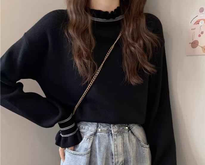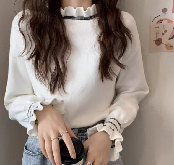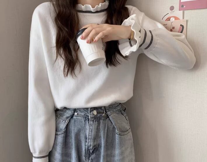 レディース トップス ニット セーター プルオーバー ショート 長袖 ドロップショルダー フリル袖 ハイネック フェミニン フリル 厚手 かわいい 大人可愛い きれいめ シンプル カジュアル 上品 おしゃれ ガーリー エレガント キュート ラグジュアリー ナチュラル 知的 シック 高級感 華やか 優しい 穏やか 秋 冬 デート お出かけ 普段使い 着回し 清楚 S M L XL ホワイト ブラック