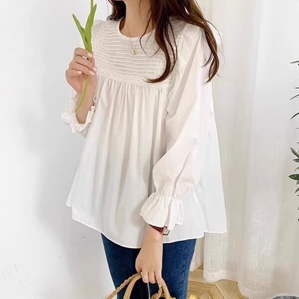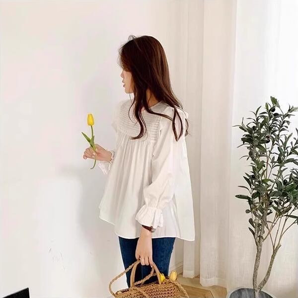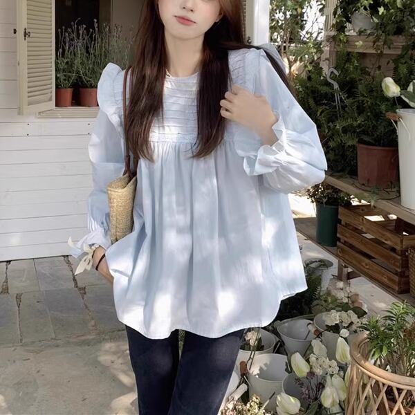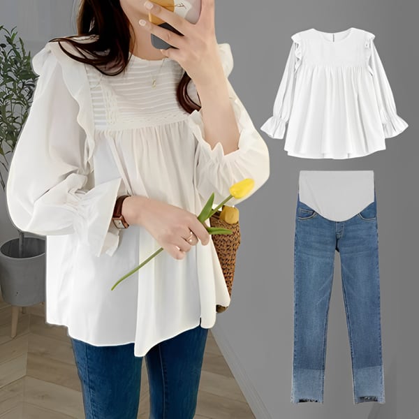 ベビードールシャツ&マタニティパンツ・二点セット 上下セット レディース トップス パンツ マタニティウェア ジーンズ Gパン デニムパンツ 長袖 ベルスリーブ ラウンドネック 襟なし ノーカラー ワイド Aライン 裾ワイド フェミニン レース シフォン ダメージ 取り外し可能 大人可愛い カジュアル 上品 ガーリー ルーズ 無地 春 秋 シーズンレス マタニティ 20代 30代 お出かけ イベント リゾート 公園 バカンス ガーデン ショッピング カフェ インスタ映え お腹カバー