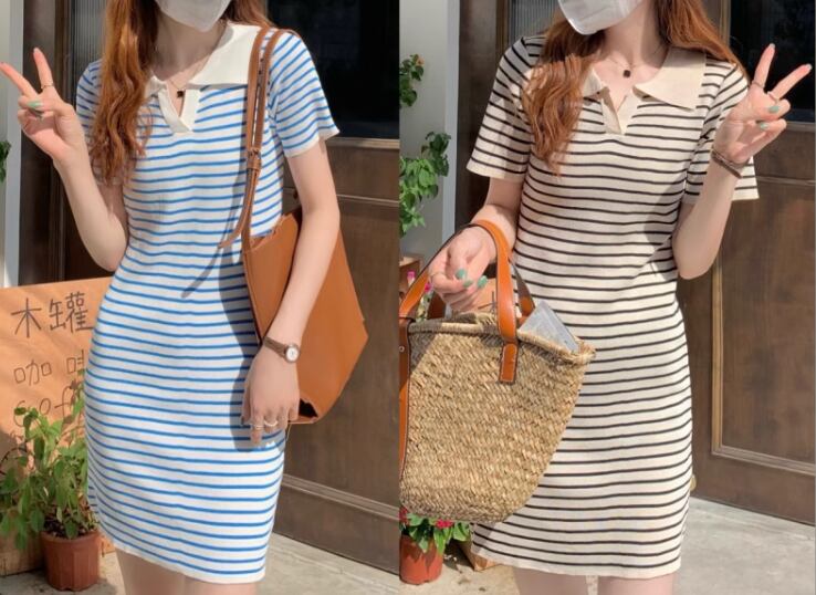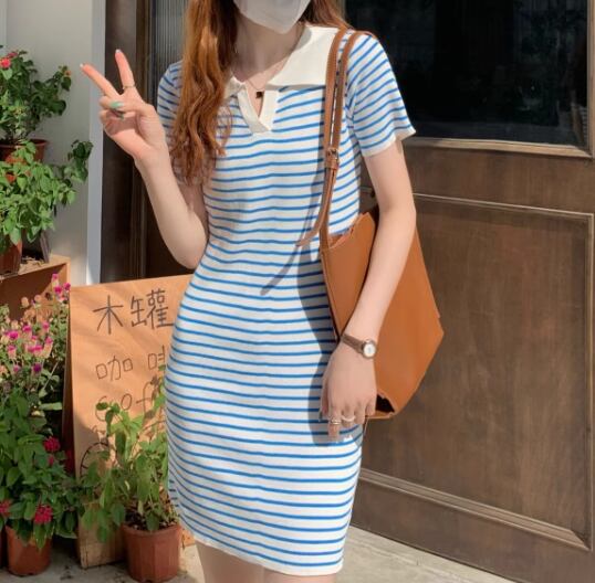 レディース ワンピース プルオーバー ニットワンピ ミニ ショート 長袖 Vネック 襟付き ポロカラー タイト スリム 細身 ハイウエスト ストレッチ 伸縮性 かわいい 大人可愛い シンプル カジュアル 上品 おしゃれ レトロ ラフ スポーティー ガーリー キュート ラグジュアリー アクティブ ボーダー 夏 10代 20代 学生 デート お出かけ 普段使い フリーサイズ 小さめ フィット ブルー アプリコット