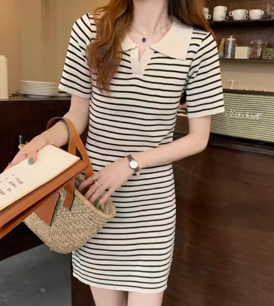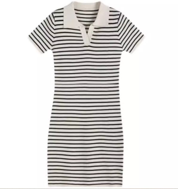 上品で落ち着いたボーダー模様×スポーティーなデザインが大人可愛いショート丈の半袖ニットワンピース。