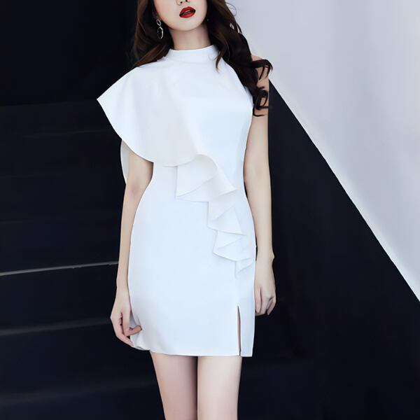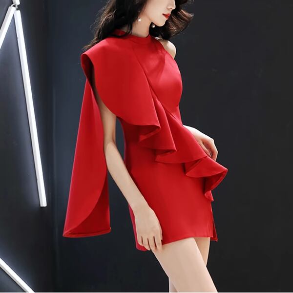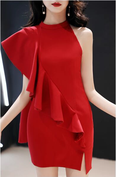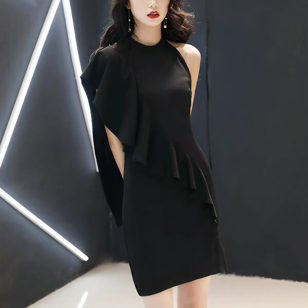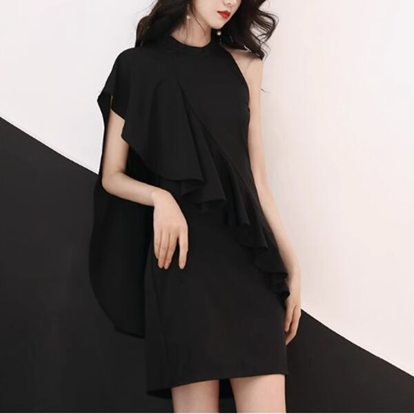 3色展開 パーティードレス イブニングドレス カラードレス パーティー 二次会 発表会 ショート 膝上 ノースリーブ ホルターネック オフショル セミフレア フリル ハイウエスト ワンステップスカート イレギュラースカート ハンギングネックスタイル スリムフィット きれいめ 大人可愛い 上品 おしゃれ アシンメトリー フォーマル ゴージャス エレガント セクシー フェミニン 女性らしい 無地 パーティー ホテル レストラン 食事会 シーズンレス 大人デザイン 大人カラー