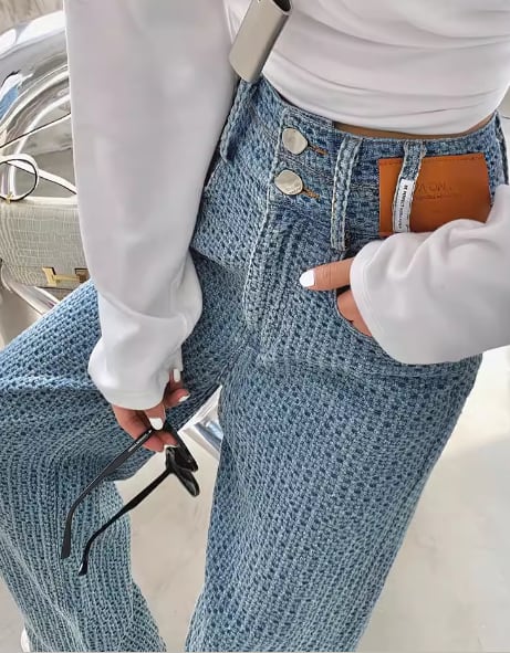 爽やかなライトブルーの色味とシンプルでメンズライクなデザインが魅力的なフルレングスのワイドストレートジーンズ。