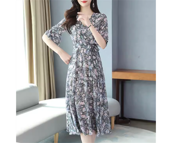 エレガントで華やかな花柄模様が美しい半袖のミモレ丈ワンピース。
