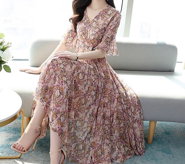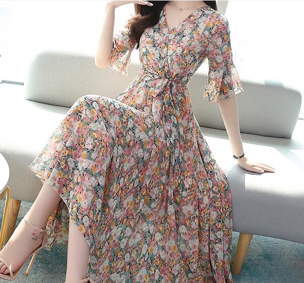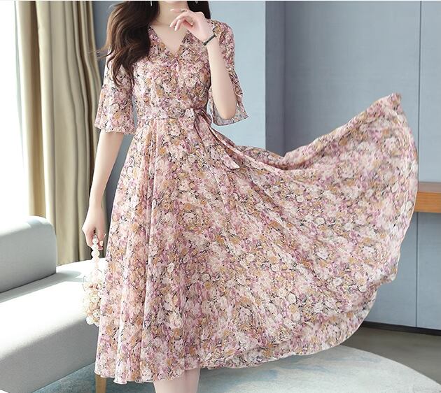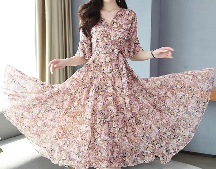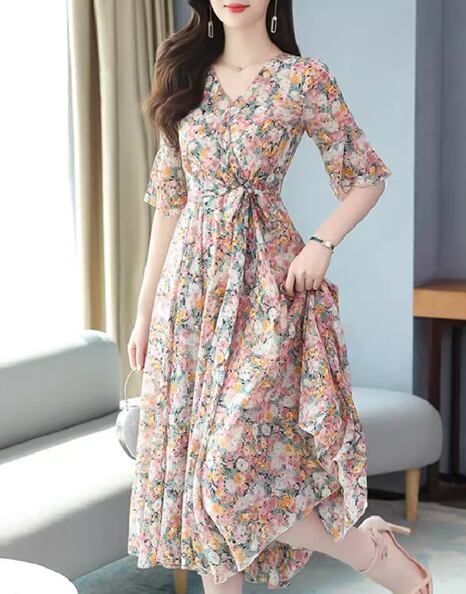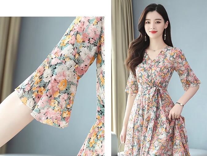 レディース ワンピース プルオーバー 膝下 ミモレ ロング 半袖 5分袖 ベルスリーブ Vネック Aライン フェミニン シフォン ウエストマーク ウエストリボン ハイウエスト かわいい 大人可愛い きれいめ 上品 おしゃれ ガーリー エレガント キュート 豪華 花柄 フラワー プリント 春 夏 デート お出かけ 普段使い モテ 清楚 スタイルアップ S M L XL 大きいサイズ イエロー ブルー パープル