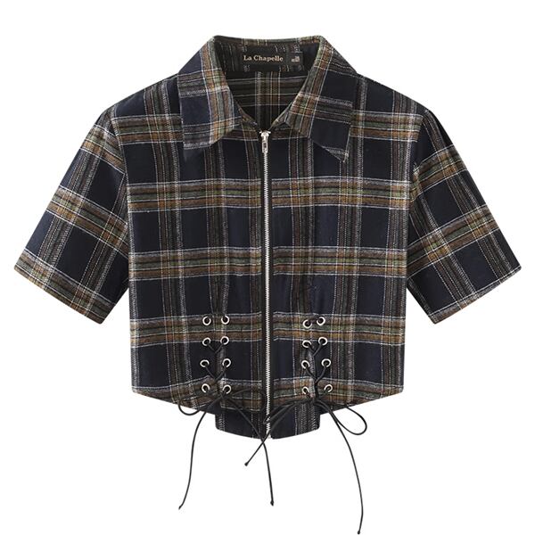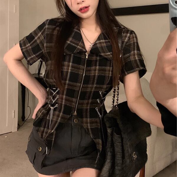 クロス巾着 レトロチェック柄 ホットガール ショートシャツ ストラップ ラペルシャツ プラスサイズ レディース トップス ジャケット シャツ ブラウス カーディガン アウター ブレザー ショート ミドル丈 半袖 ポロカラー スリム オーバーサイズ ストリート ファスナー 前開き ドロスト バイカラー カジュアル おしゃれ かっこいい レトロ ラフ ルーズ オフィスカジュアル チェック 春 夏 秋 10代 20代 オフィス 通勤 イベント レストラン ガーデン ショッピング カフェ