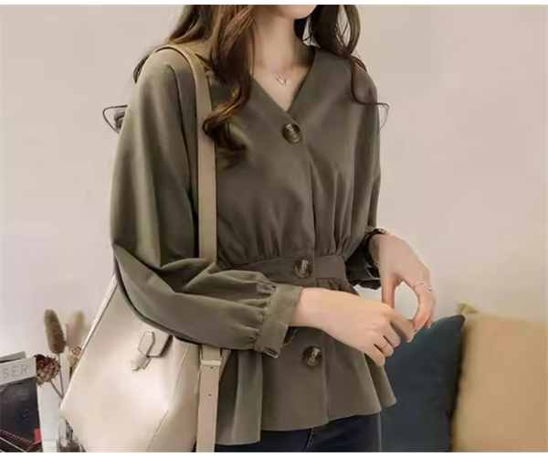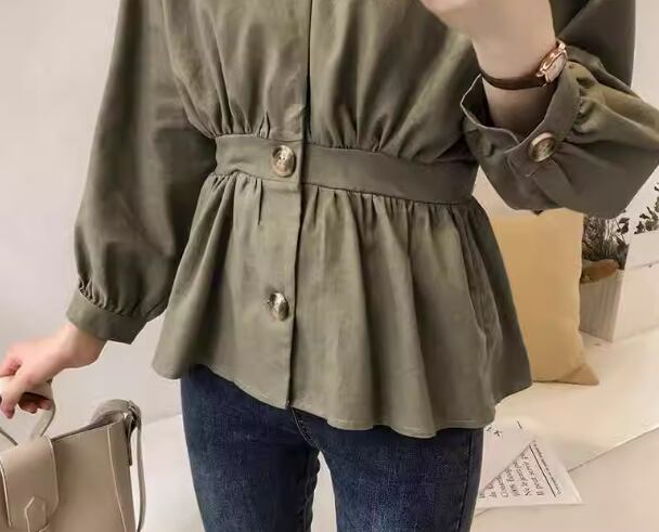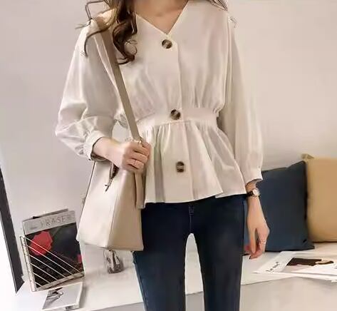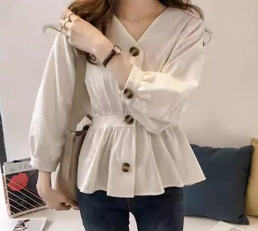 レディース トップス シャツ カットソー ミドル丈 長袖 Vネック 襟なし ノーカラー ペプラム フェミニン フリル ウエストマーク 前開き ボタン かわいい 大人可愛い きれいめ シンプル カジュアル 上品 おしゃれ ガーリー エレガント キュート ラグジュアリー ナチュラル シック フェアリー 無地 春 秋 デート お出かけ 韓国 体型カバー 普段使い 着回し M L XL ホワイト ブラック グリーン