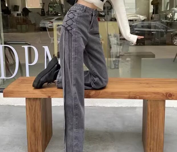 ウォッシュ加工とサイドのレースアップデザインがおしゃれなフルレングスのワイドストレートジーンズ。