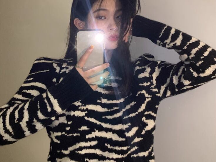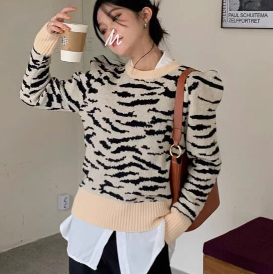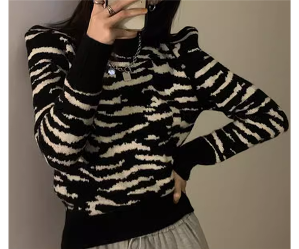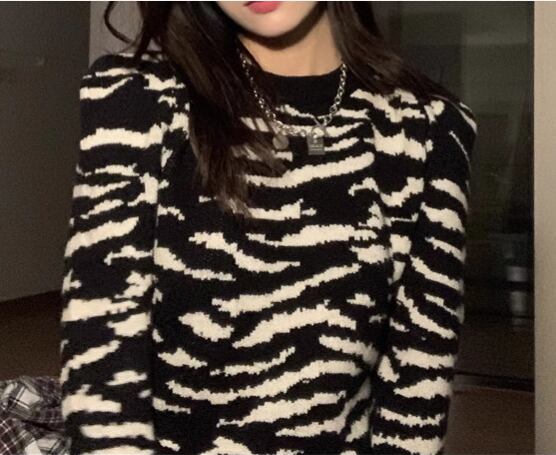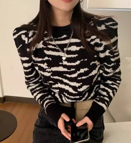 レディース トップス ニット セーター プルオーバー ショート クロップド丈 長袖 ラウンドネック スリム 細身 異国風 かわいい 大人可愛い カジュアル おしゃれ かっこいい こなれ感 ボーイッシュ 個性的 クール エレガント 存在感 ラグジュアリー ワイルド 豪華 ハンサム シック セブラ柄 プリント 春 秋 冬 デート お出かけ 普段使い 着回し S M L XL 大きいサイズ 小さめ ホワイト ブラック