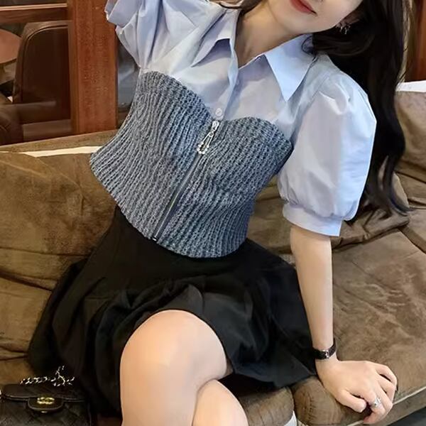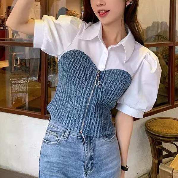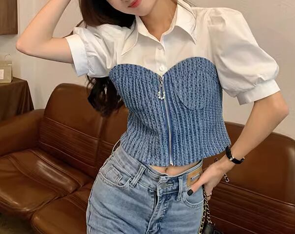 デニムステッチのショートシャツ。デザインニッチな香港スタイルで、シックでフレンチな印象を与えます。軽やかな夏の装いに最適なスリムな半袖トップで、ポロカラーやパフスリーブがエレガントなアクセント。洗練されたデザインでありながら、リラックス感も忘れない一枚。夏のスタイリングに、個性とスタイルをプラスします。