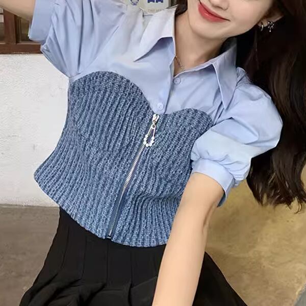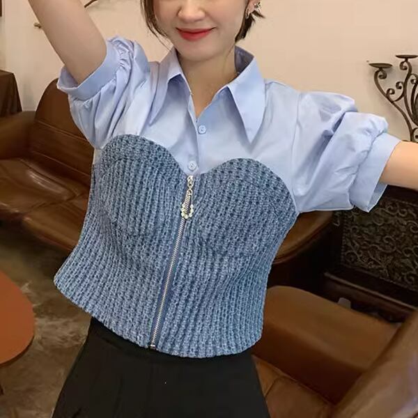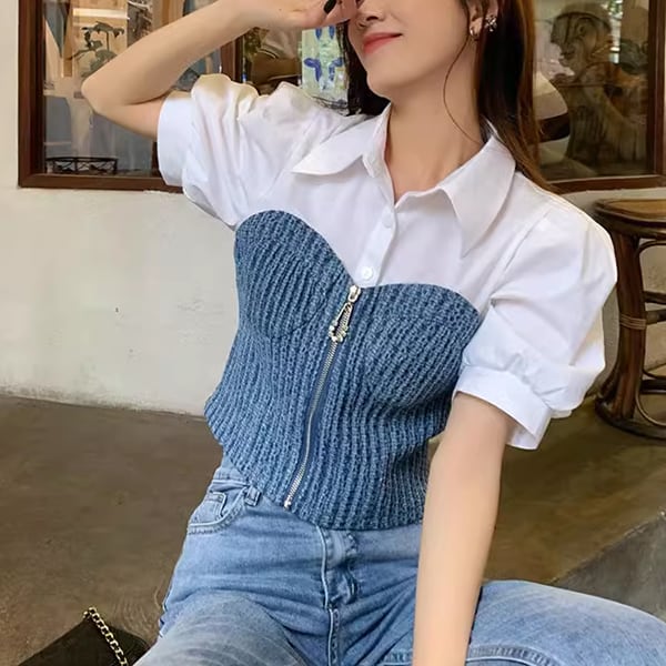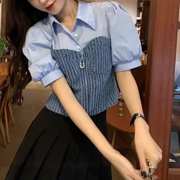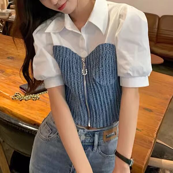 2カラー デニムステッチシャツ・フェイクツーピース レディース トップス シャツ ブラウス ショート 半袖 パフスリーブ ポロカラー 細身 ストレート ファスナー バイカラー かわいい 大人可愛い カジュアル 上品 おしゃれ エキゾチック エレガント 爽やか オフィスカジュアル ステッチ 春 夏 秋 10代 20代 オフィス 通勤 アウトドア イベント バカンス ガーデン ショッピング ライブ カフェ ドライブ コーデ フィット