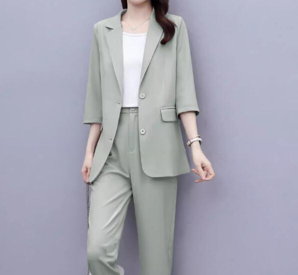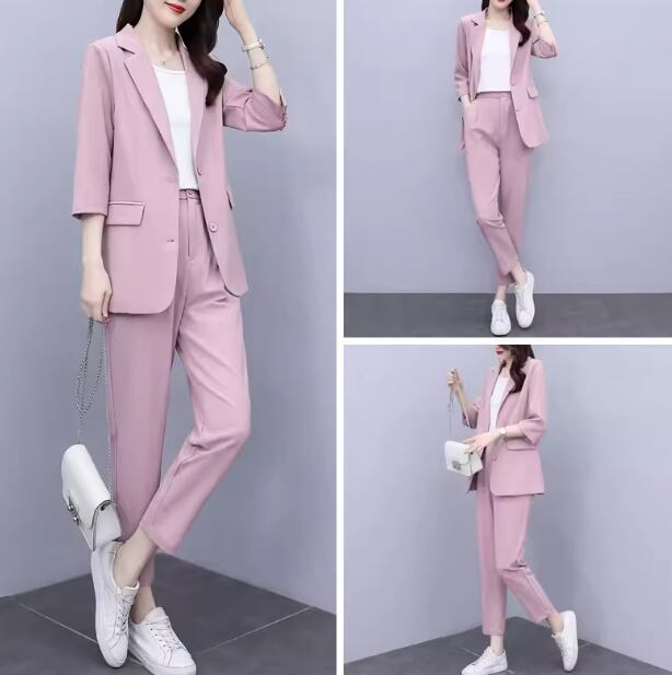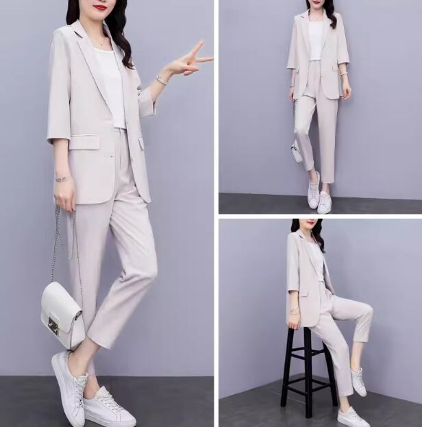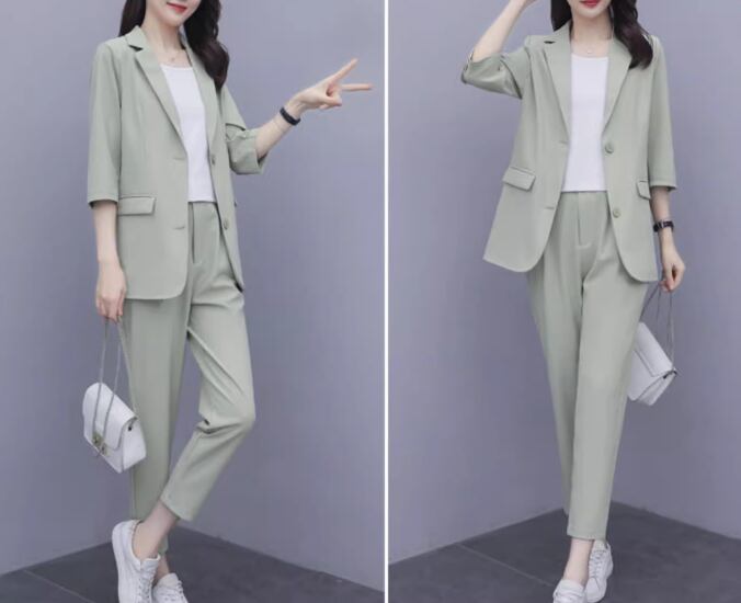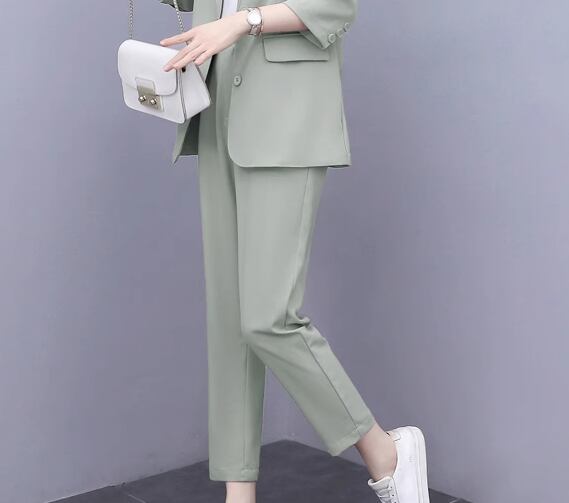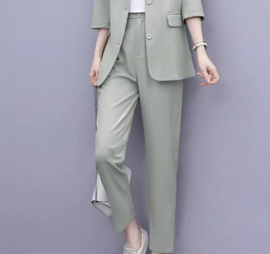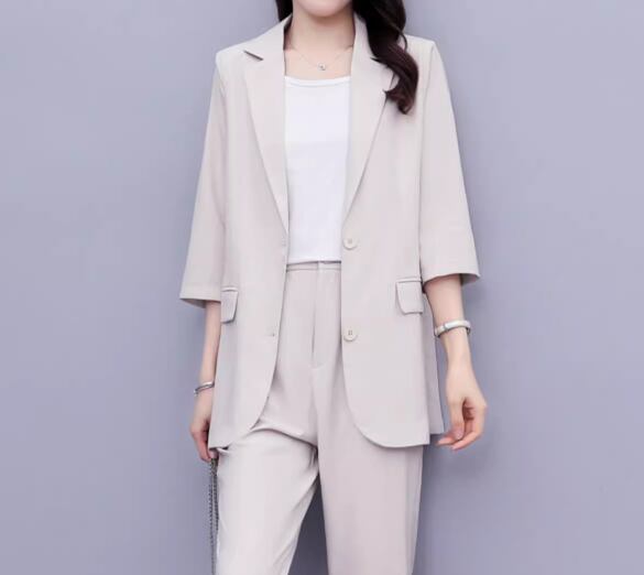 七分袖のミドル丈ジャケットとくるぶし丈のクロップドパンツの二点セットです。