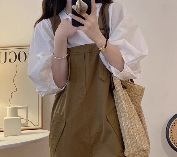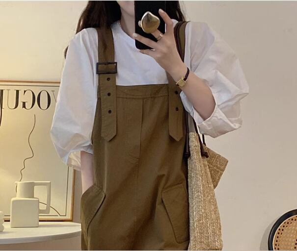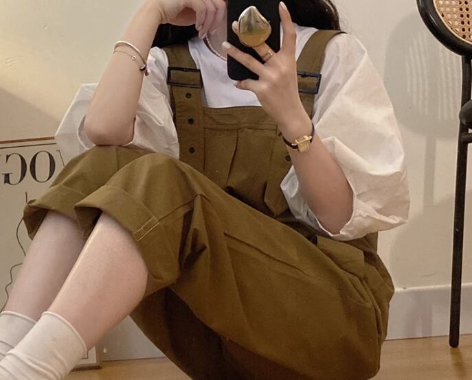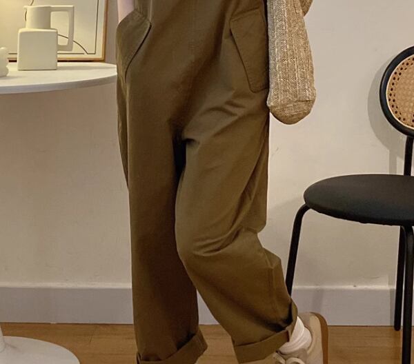 レトロな雰囲気が可愛いカーキ色のオーバーオール。