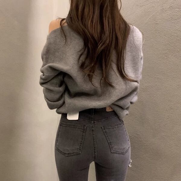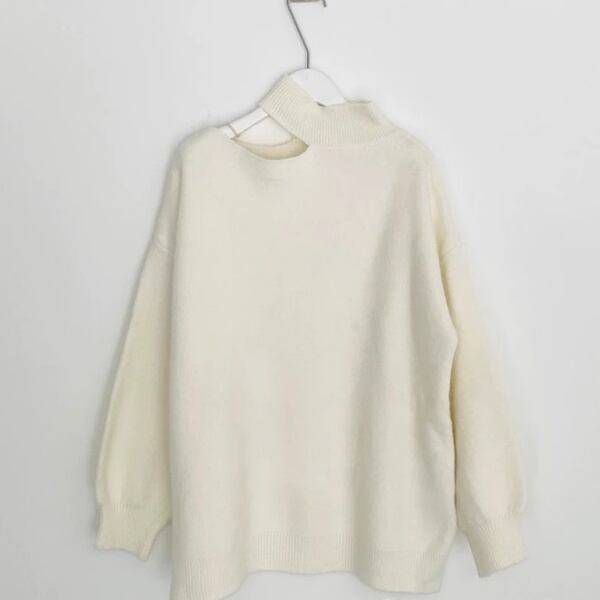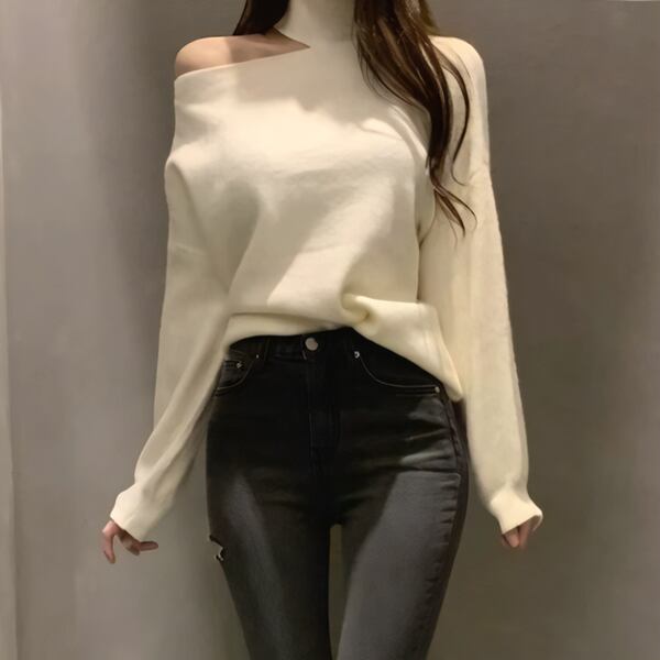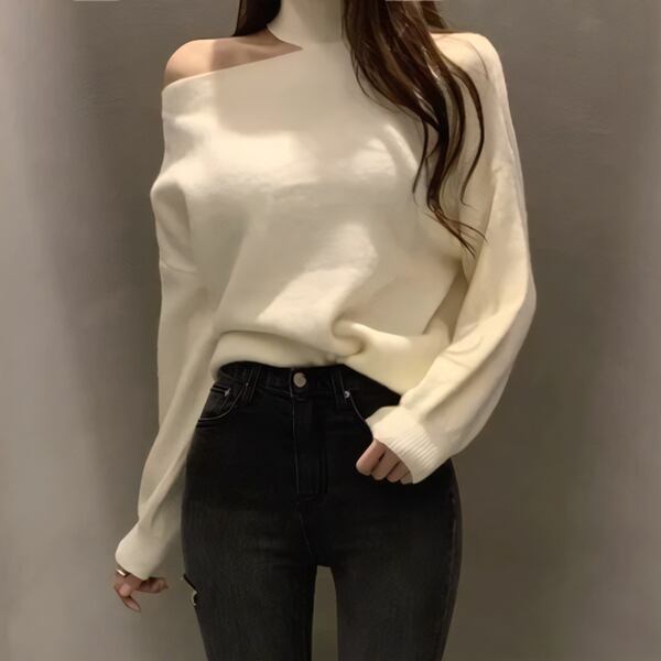シックな秋冬スタイルを演出するフレンチニッチデザインのシングルオフショルダー、ルーズフィットのタートルネックセーター。暖かくておしゃれなニットセーターをお探しの方にぴったりです。