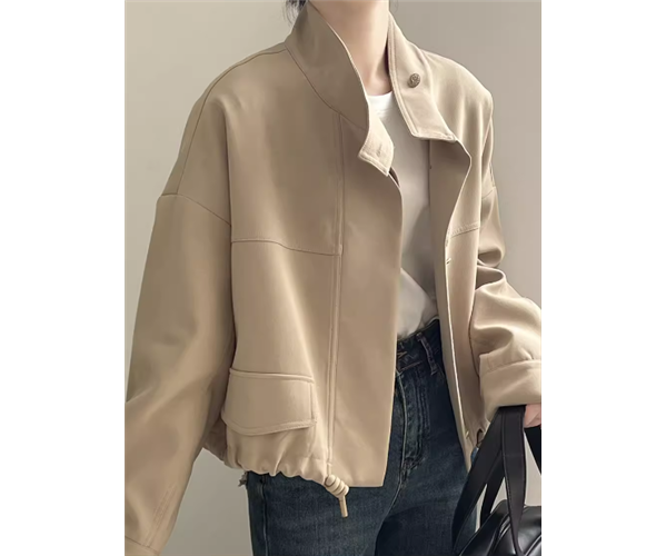 上品で落ち着いた色味とシンプルで洗練されたデザインが大人っぽいショート丈のノーカラージャケット。