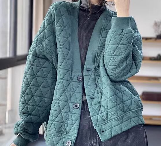 しっかりとした厚みのあるVネックのキルティングジャケット。
