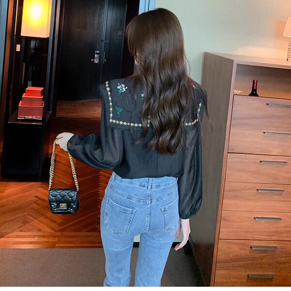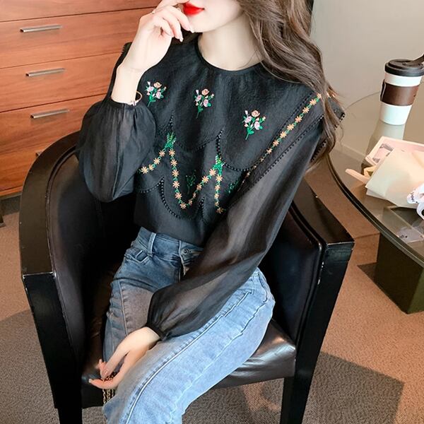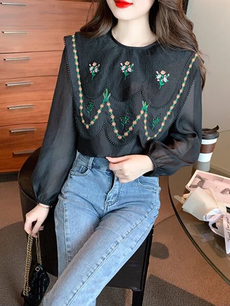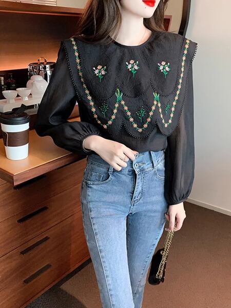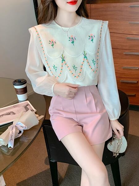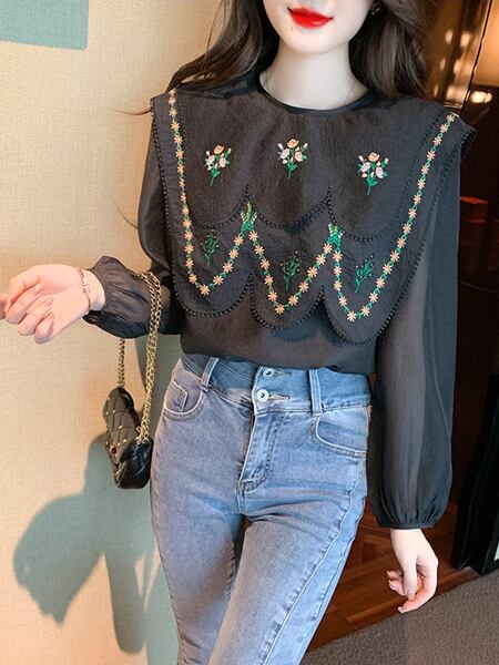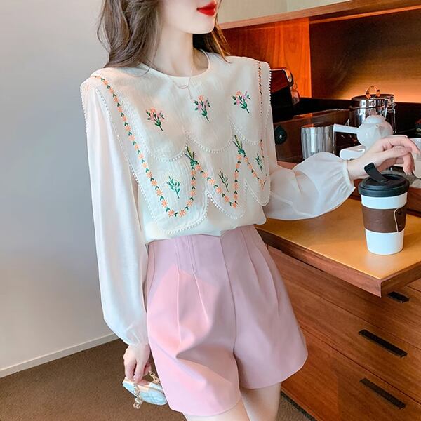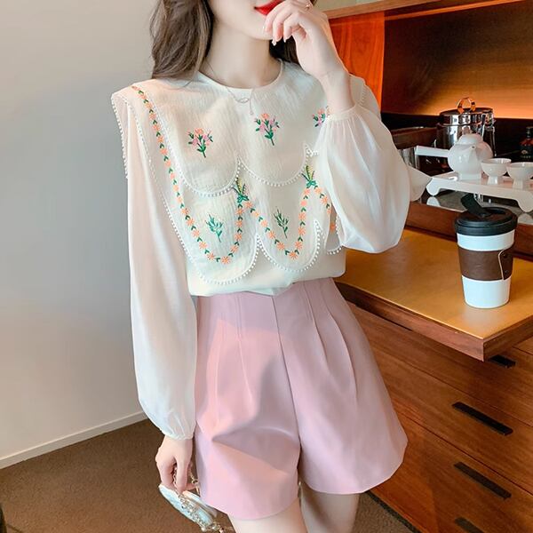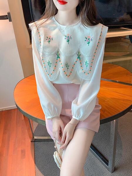 2カラー フレンチドールカラー/シフォンシャツ レディース トップス シャツ ブラウス ショール ラウンドネック 襟なし 丸襟 ノーカラー スリム 刺繍 ビーズ かわいい 大人可愛い おしゃれ レトロ ガーリー ルーズ エレガント メルヘン 無地 春 秋 20代 30代 オフィス OL 通勤 カフェ 普段使い