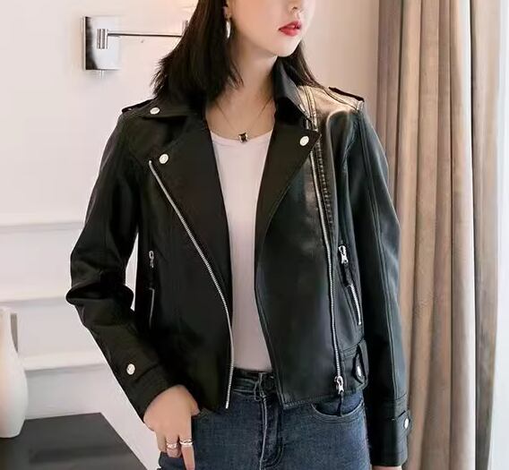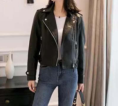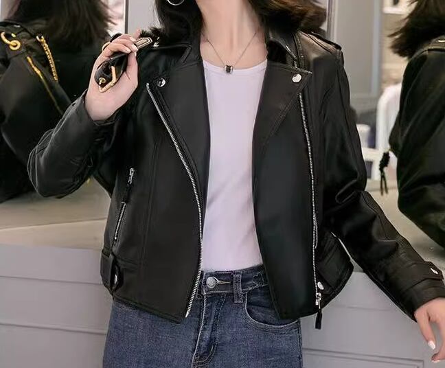 スマートで美しいシルエットとシンプルで洗練されたデザインが魅力的な大人可愛いショート丈のレザージャケット。
