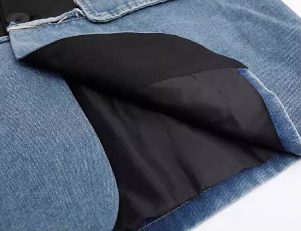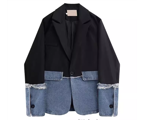 スーツ生地×デニム生地のドッキングデザインがおしゃれなミドル丈のジャケット。