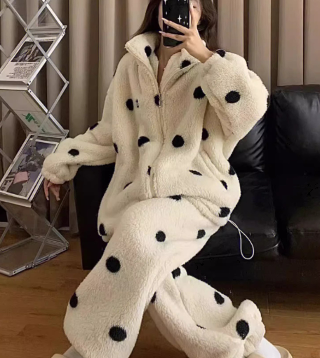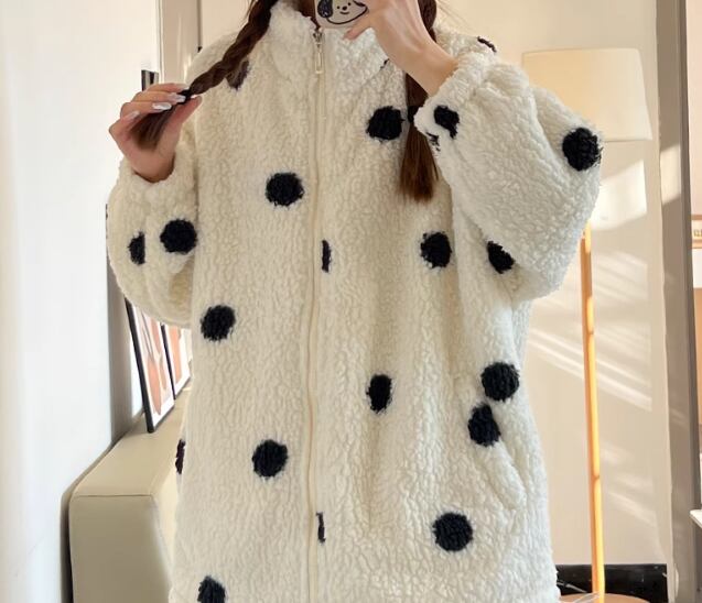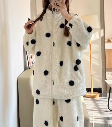 大きめの水玉模様とふわふわもこもこの極上の肌触りが魅力的な秋冬用パジャマの上下セット。