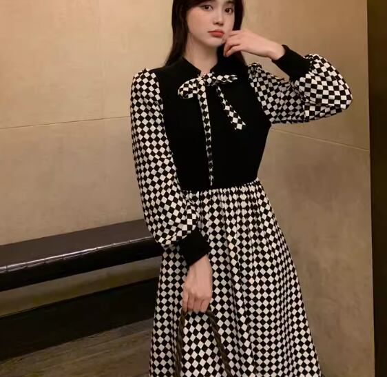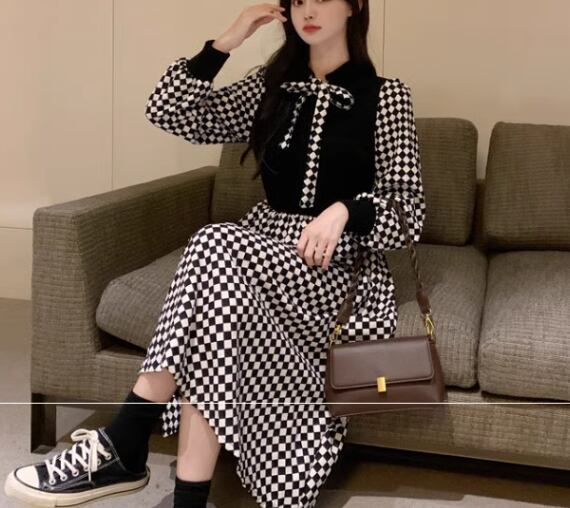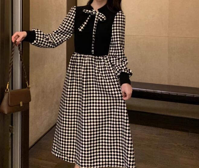 重ね着風 フェイクツーピース レディース ワンピース プルオーバー ミモレ ロング 長袖 フェミニン リボン ウエストマーク 切り替えデザイン ドッキング かわいい 大人可愛い きれいめ 上品 おしゃれ レトロ ガーリー エレガント キュート クラシカル ナチュラル 知的 シック 高級感 チェック 春 秋 冬 10代 20代 学生 デート お出かけ 普段使い 清楚 M L XL 大きいサイズ ブラック