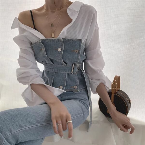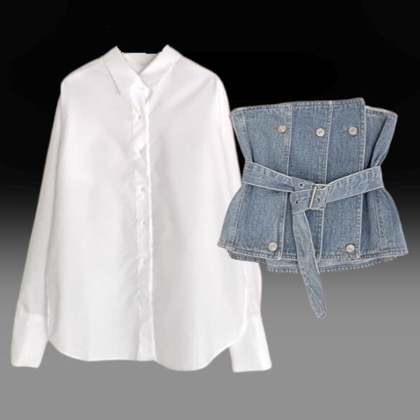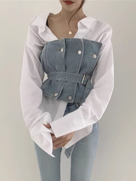【シャツ&ベストセット】「ストライプ長袖シャツ・ホワイト」&「ウエスタン風ベルト付きデニムベスト」セット レディース トップス ベスト アウター ショート 袖なし ノースリーブ タイト スリム 細身 カシュクール デニム ラペル カジュアル かっこいい レトロ ルーズ 無地 シーズンレス 10代 20代 通勤 アウトドア キャンプ ガーデン ライブ ツーリング コーデ レイヤード