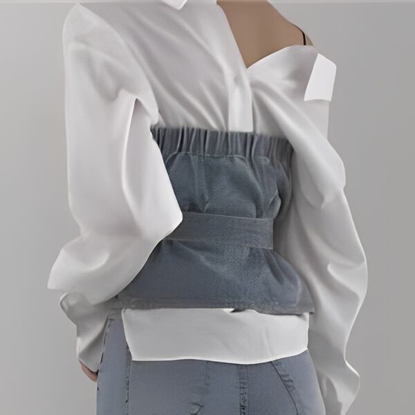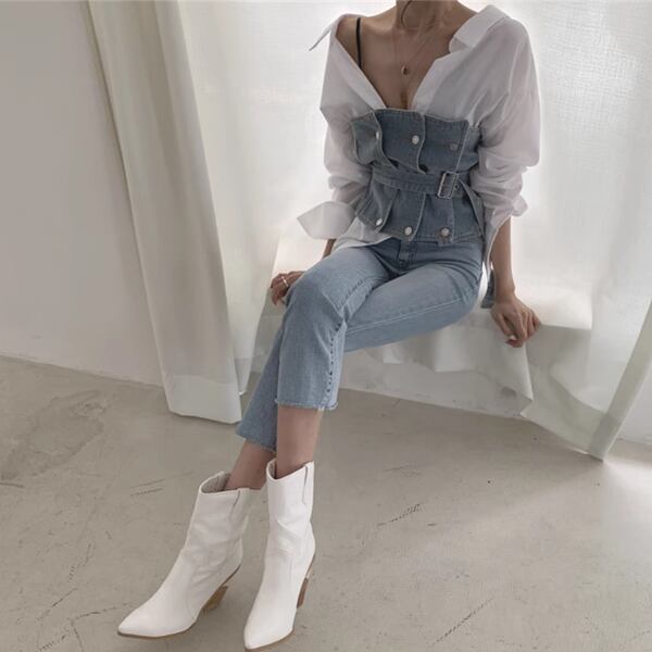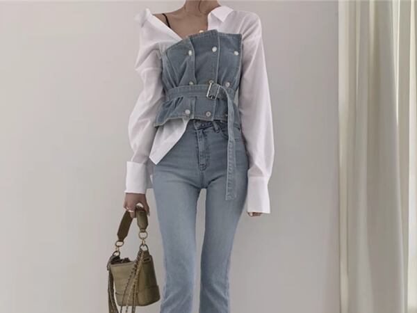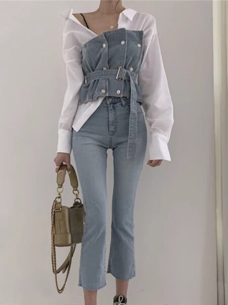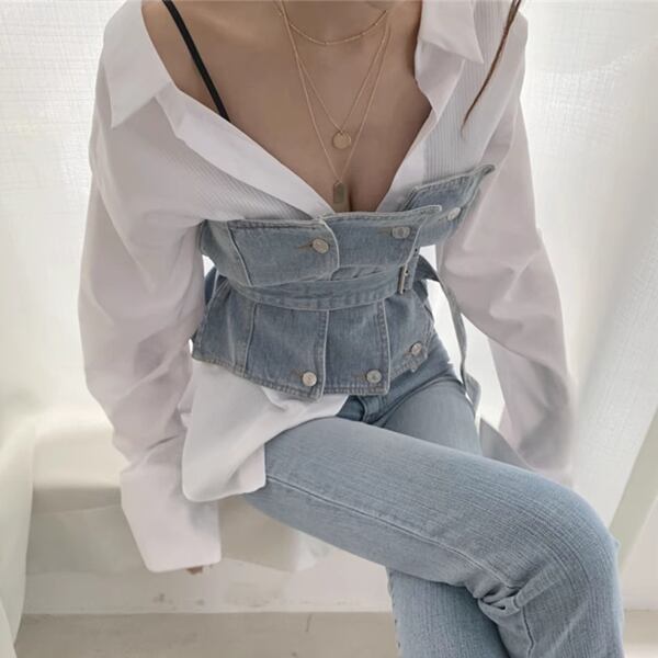 スタイリッシュなチューブトップ。ウエスタン風ベルトがアクセントのデニムベスト。ホワイトの長袖シャツとセットでのご提供です。トレンド感溢れるデザインで、カジュアルなコーディネートにアクセントをプラスしてくれます。