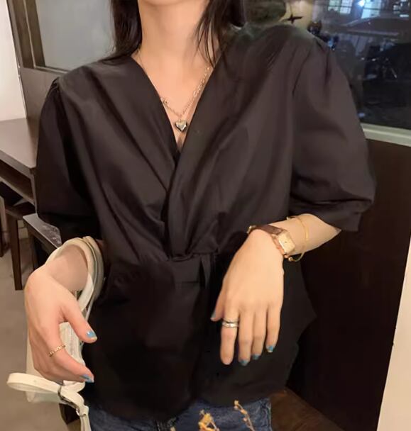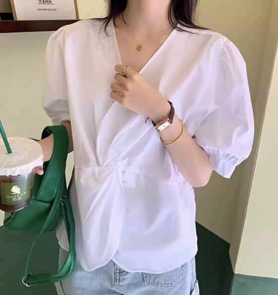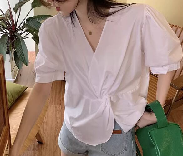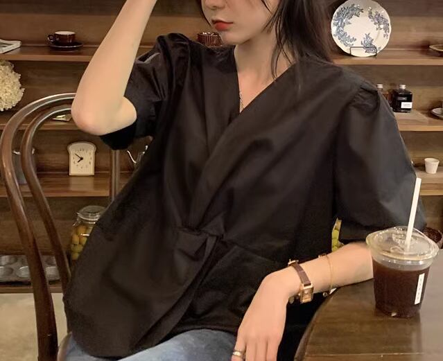 レディース トップス シャツ カットソー プルオーバー Tシャツ ショート 半袖 ボリューム袖 パフスリーブ Vネック カシュクール ストレート フェミニン 大人可愛い きれいめ シンプル カジュアル 上品 おしゃれ かっこいい ラフ ボーイッシュ ルーズ クール エレガント ナチュラル シック 高級感 無地 夏 デート お出かけ 普段使い 着回し L XL 大きいサイズ ホワイト ブラック ブラウン