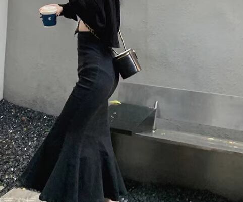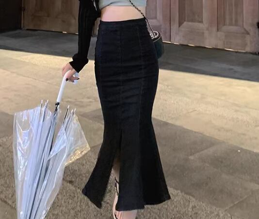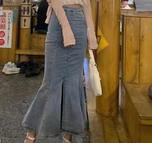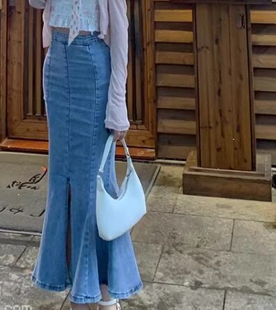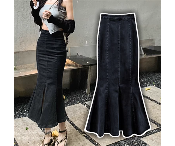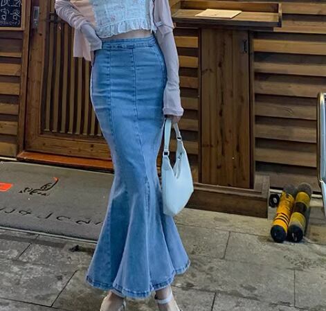女性らしい曲線美が強調される美しいマーメイドシルエットが魅力的なロング丈のデニムスカート。